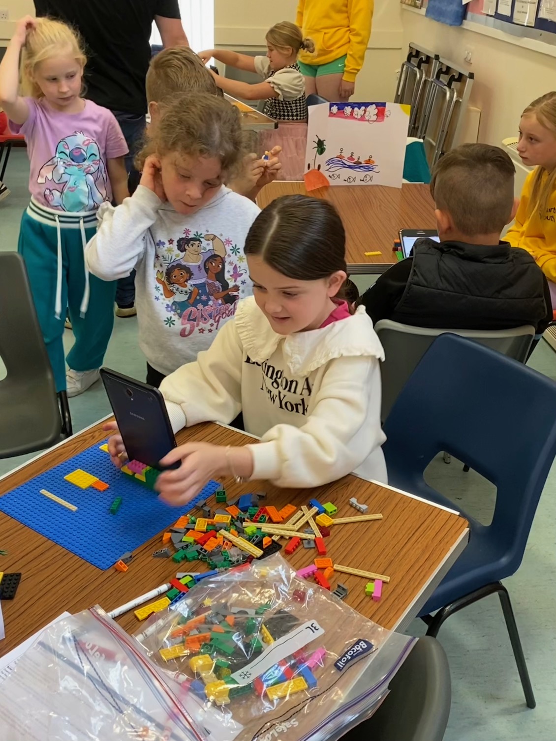 To start the activity, we divided the children into small groups and provided each with a Lego kit and digital tablet. They decided where their film was going to be set and drew their backdrop on a folded white card. Then they had fun creating the Lego props and choosing Lego people to star in the film. They also created a stand to prop up the tablet they would use for the filming.